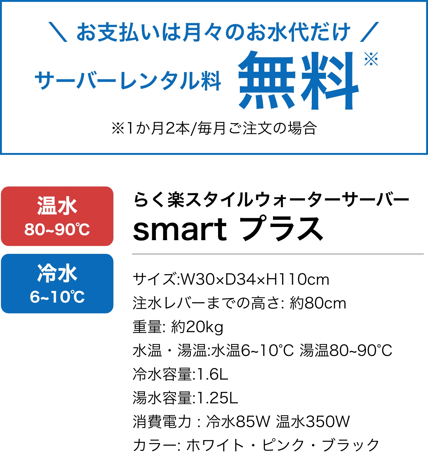 約6度の冷水と約85度の温水がいつでも使えるのでとても便利です。温水は小さなお子様がいるご家庭にも安心な、ロック付きの安全レバーを採用。また、光熱費も電気ポットとほぼ同じくらいなのでとても経済的です。冷蔵庫からペットボトルを毎回出し入れすることもなく、お湯が湧くまで待つ事もないので、いつでも手軽に美味しく天然水を飲むことが出来ます。