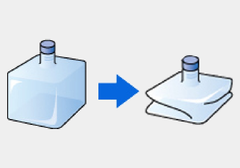 天然水を使用するにつれて、小さくたためていく特許取得済の天然水ボトルを使用しているので、