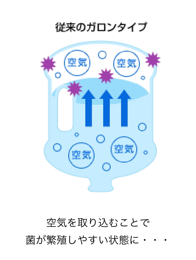 ウォーターサーバー内部のタンクの構造上、冷水タンクには少なくとも空気を取り込まなければ水が出ない仕組みです。空気中の様々な細菌・雑菌がタンク内に入ると菌が増殖します。ミネラルウォーターは殺菌力がないので、菌にとってこれ以上ない繁殖場所です。菌が繁殖するスピードも空気中とは比べものにならない早さで繁殖しますので衛生的にも問題があります。