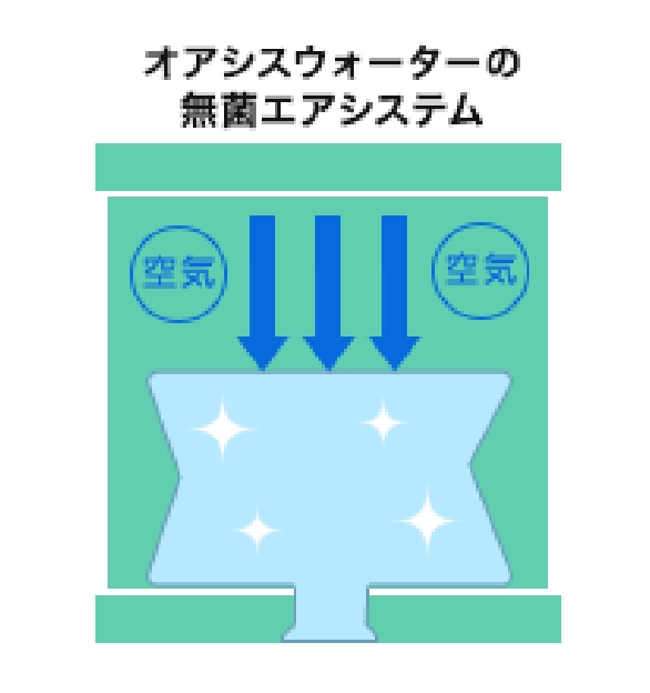 空気が直接触れにくく天然水が少なくなるにつれボトルがどんどん小さくなります。オアシスウォーター独自の無菌エアーシステムはその冷水タンクに入る空気を限りなく無菌状態にするシステムなので、安心・安全です!