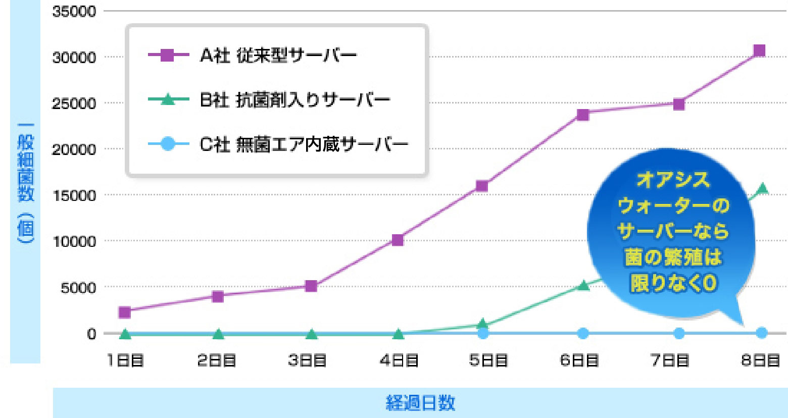 ※本グラフはウォーターサーバーの傾向を示すための比較試験です。水やウォーターサーバーの種類、 設置場所・環境、使用量、メンテナンスなどによって、異なる傾向が得られる可能性があります。